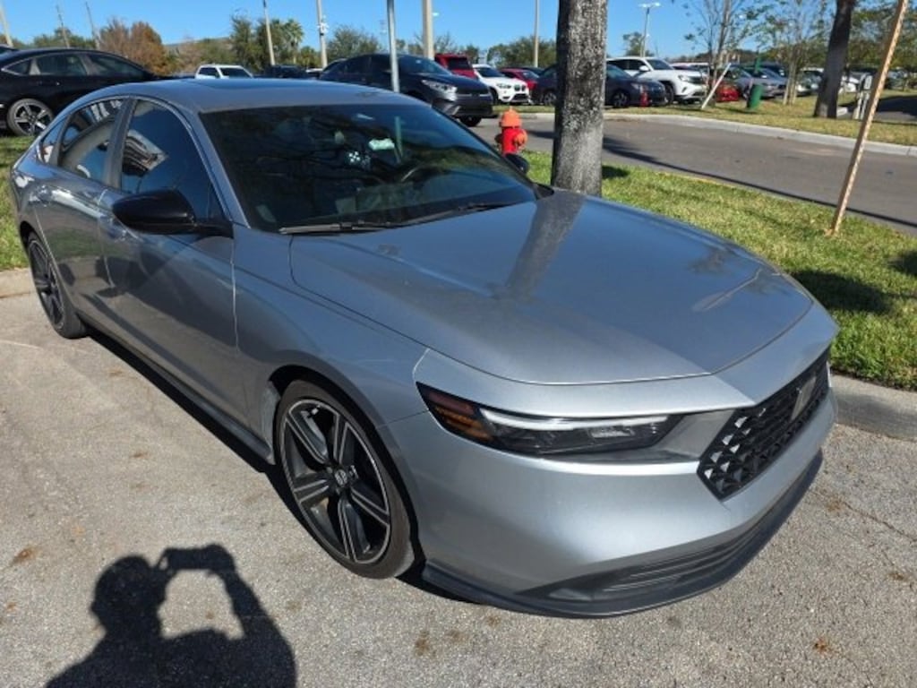 Honda Certified! 7 year 100,000 Mile Factory Warranty! HONDA CERTIFIED, ONE OWNER, CLEAN CARFAX, WIRELESS APPLE CARPLAY, WIRELESS ANDROID AUTO, APPLE CARPLAY, ANDROID AUTO, BLUETOOTH, HANDSFREE, BACKUP CAMERA, SUNROOF, POWER LOCKS, ALLOY WHEELS, LOCAL TRADE, BOUGHT AND SERVICED AT COGGIN HONDA OF ORLANDO, EXCELLENT SERVICE HISTORY, COME SEE THIS TODAY!, PRICE INCLUDES ALL RECONDITIONING FEES, Accord Hybrid Sport, 4D Sedan, 2.0L 16V DOHC, eCVT, FWD, Black Cloth, 4-Wheel Disc Brakes, 8 Speakers, Adaptive Cruise Control: Adaptive Cruise Control (ACC) with Low-Speed Follow, Air Conditioning, AM/FM radio, Apple CarPlay/Android Auto, Auto High-beam Headlights, Automatic temperature control, Brake assist, Bumpers: body-color, Compass, Delay-off headlights, Driver door bin, Driver vanity mirror, Dual front impact airbags, Electronic Stability Control, Emergency communication system: HondaLink, Exterior Parking Camera Rear, Four wheel independent suspension, Front anti-roll bar, Front dual zone A/C, Front reading lights, Fully automatic headlights, Illuminated entry, Leather Shift Knob, Low tire pressure warning, Occupant sensing airbag, Overhead airbag, Panic alarm, Power door mirrors, Power driver seat, Power moonroof, Power steering, Power windows, Radio data system, Radio: 180-Watt Audio System, Rear anti-roll bar, Rear side impact airbag, Rear window defroster, Remote keyless entry, Security system, Speed control, Speed-sensing steering, Spoiler, Steering wheel mounted audio controls, Traction control. 46/41 City/Highway MPG KBB Fair Market Range High: $25,387 CARFAX One-Owner. Certified. 2023 Honda Accord Hybrid Sport Lunar Silver Metallic 2023 Honda Accord Hybrid Sport 4D Sedan FWD eCVT 2.0L 16V DOHC