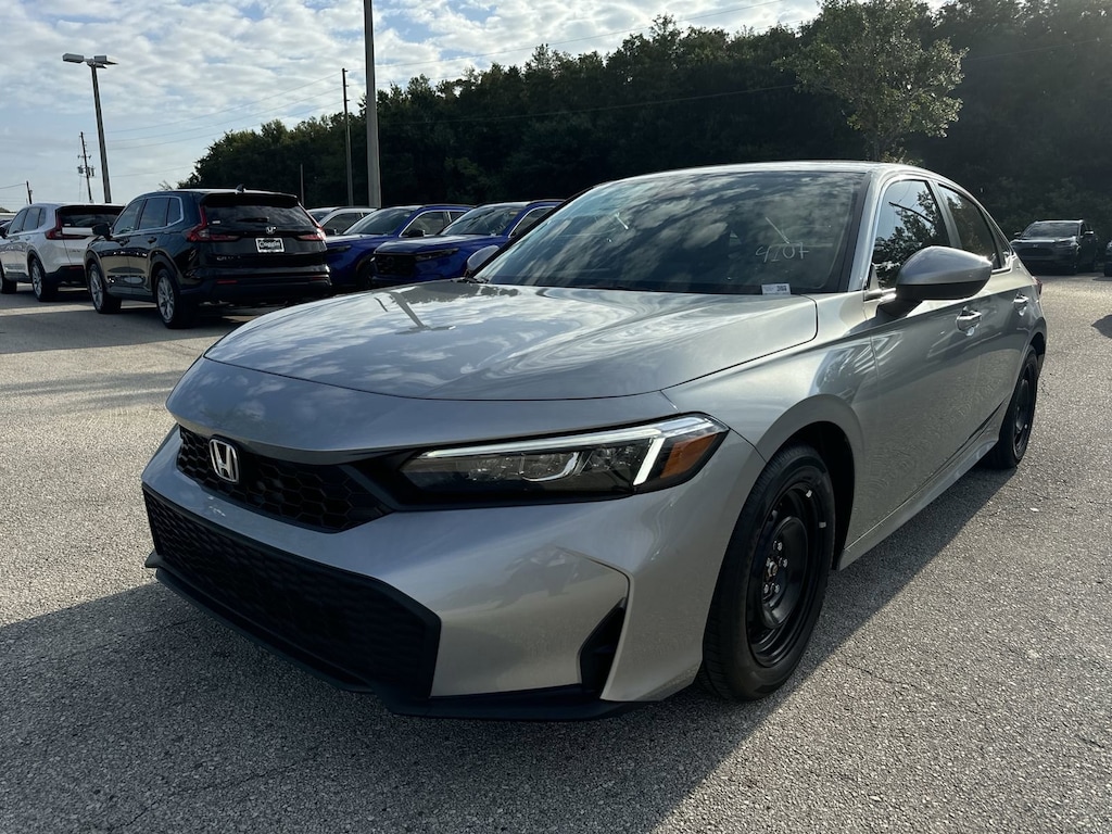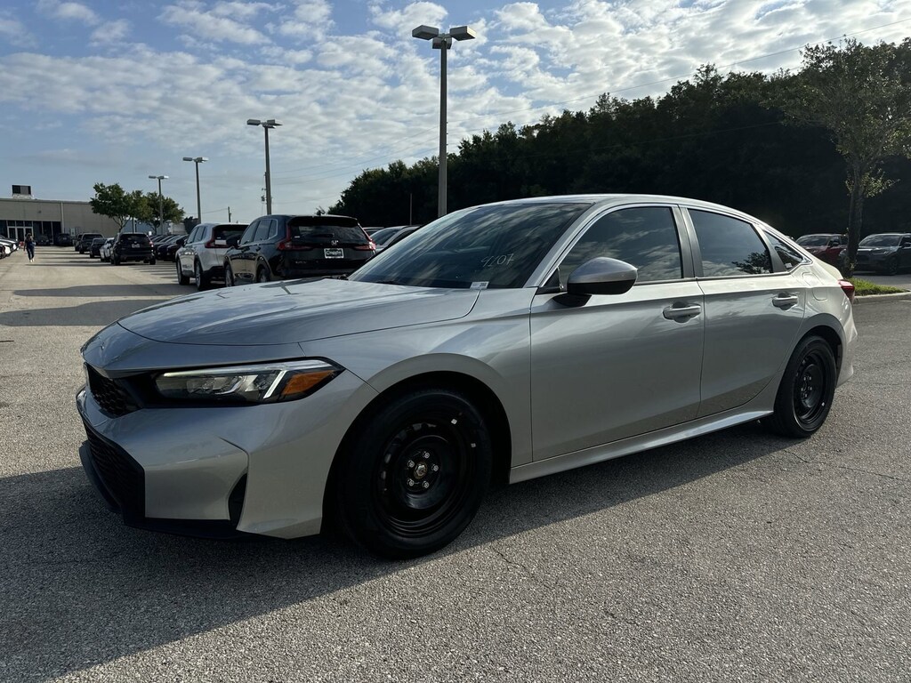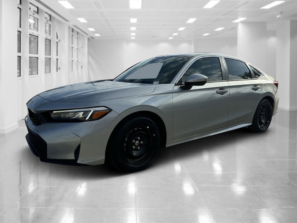 Solar Silver Metallic 2026 Honda Civic 4D Sedan LX CVT 2.0L I4 DOHC 16V 32/41 City/Highway MPG Black Cloth.