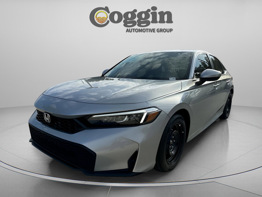 Solar Silver Metallic 2026 Honda Civic 4D Sedan LX CVT 2.0L I4 DOHC 16V 32/41 City/Highway MPG Black Cloth.